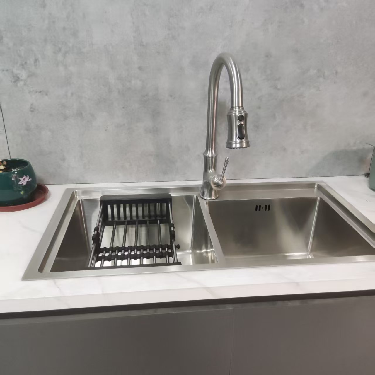 3. लचीले सिंगल/डबल बाउल विकल्प: सिंगल बाउल छोटी रसोई के लिए जगह बचाता है; डबल बाउल विभाजित सफाई (एक साथ सफाई + भिगोना) का समर्थन करता है। गहरा कटोरा (≥25 सेमी) आसानी से बड़े कुकवेयर को पकड़ सकता है, जो विभिन्न परिवारों और रसोई लेआउट की जरूरतों को पूरा करता है।