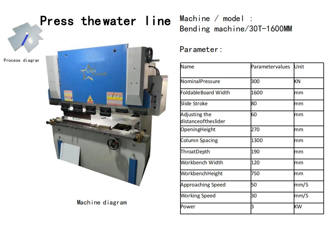 | प्रक्रिया 6 | पानी की लाइन को दबाएं | बेंडिंग मशीन/30T-1600MM | 2600x1400x2000मिमी | 2.6 | 1.4 | 3 |